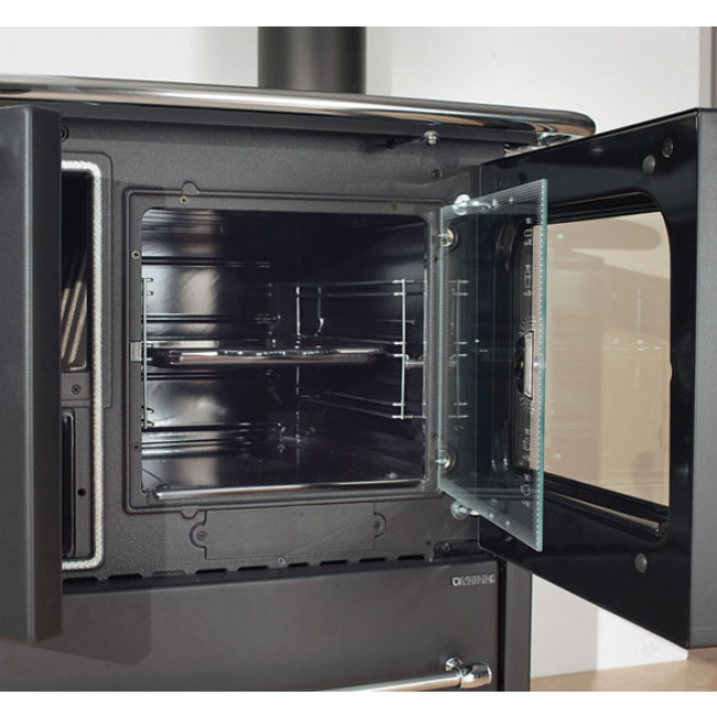 Topeniště a rošt, stejně jako přední část a dvířka z litiny a dvojité zasklení činí tento sporák obzvláště robustním a odolným vůči vysokým teplotám. Tento sporák je opláštěn smaltovanou ocelí a má moderní vzhled, který se bez problémů hodí do každé kuchyně.